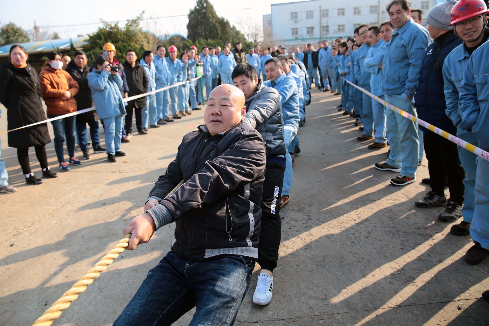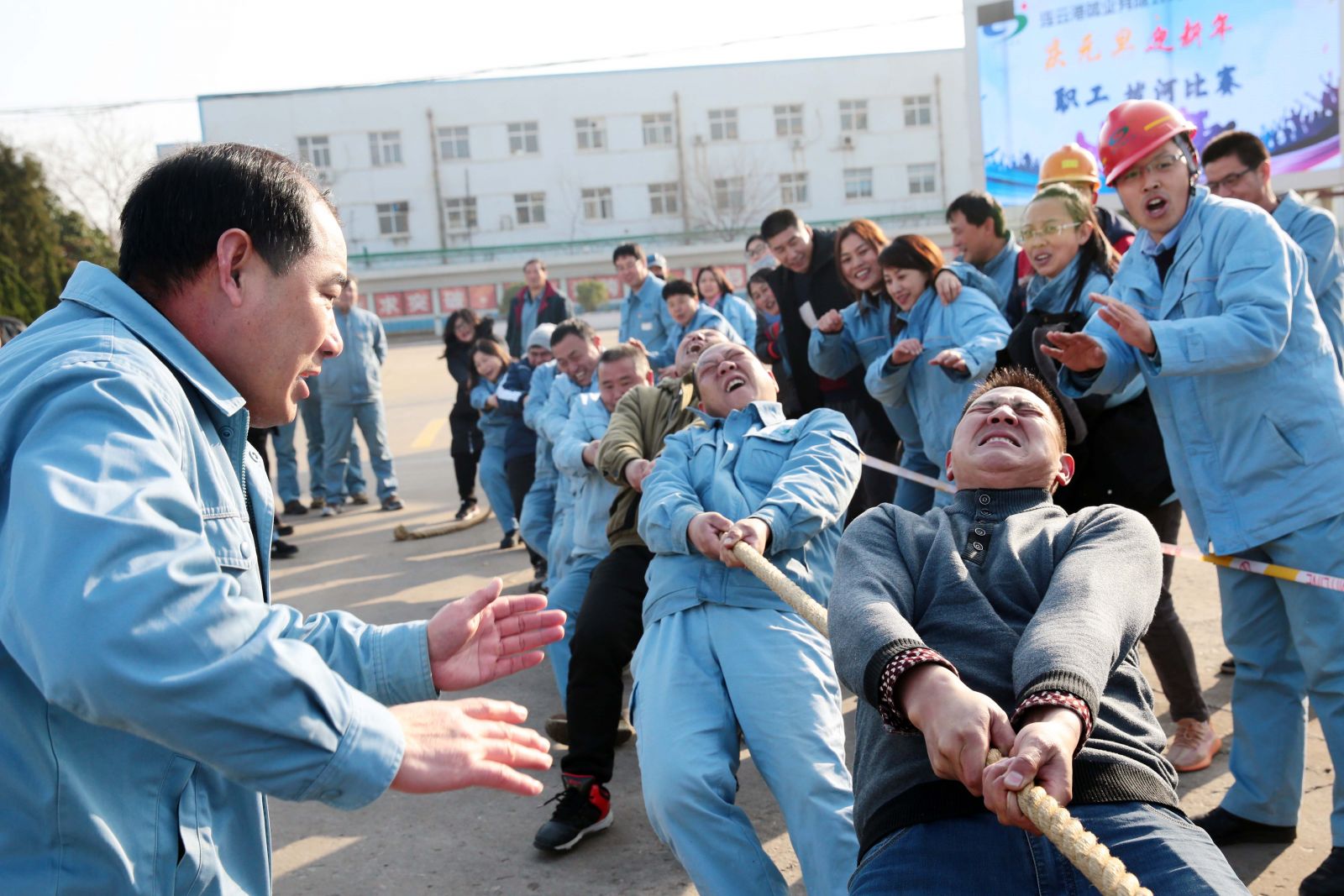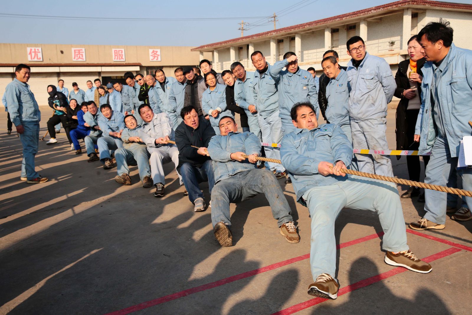 隨著(zhù)裁判的一聲哨響,各名選手緊握繩索,咬緊牙關(guān),一觸即發(fā),彎腰、下蹲、跨步,后仰、發(fā)力,整個(gè)動(dòng)作整齊劃一,一氣呵成。未參賽的員工自發(fā)組成啦啦隊為比賽隊員助威,加油聲、吶喊聲、喝彩聲,此起彼伏,飄蕩在公司上空。