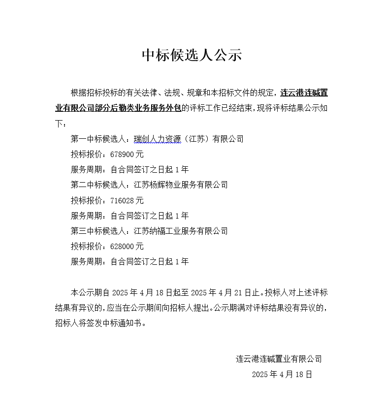 連云港連堿置業(yè)有限公司部分后勤類(lèi)業(yè)務(wù)服務(wù)外包中標候選人公示