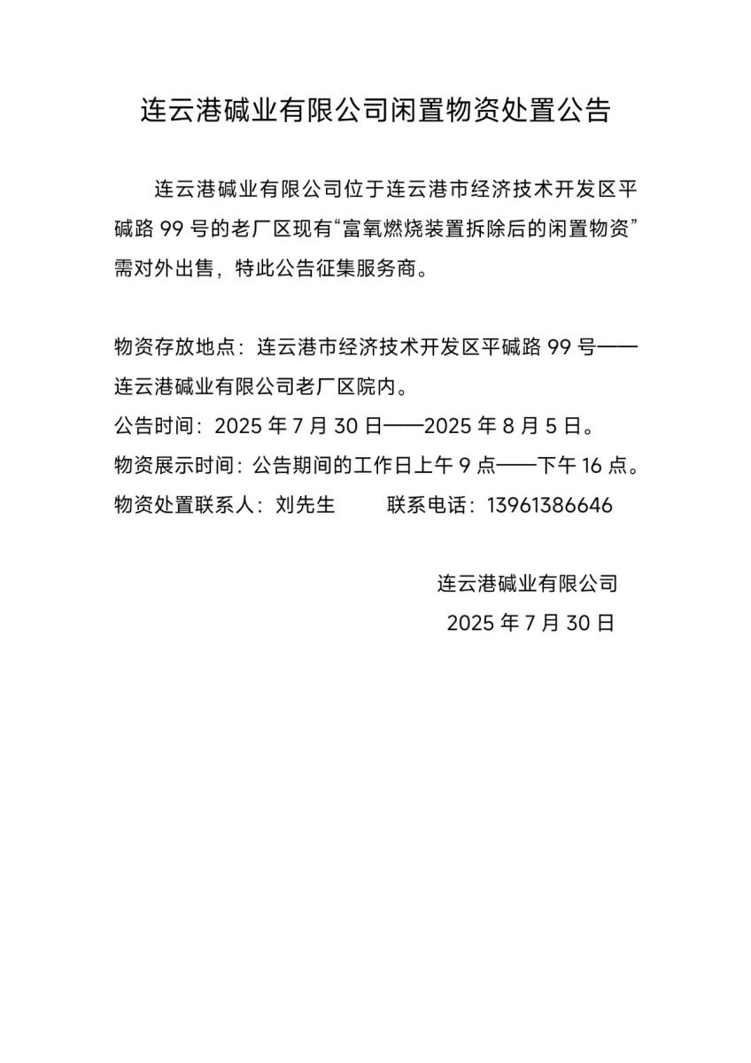 連云港堿業(yè)有限公司閑置物資處置公告