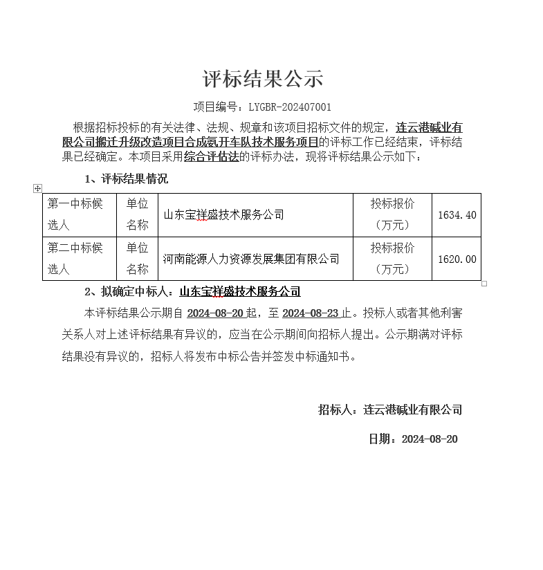搬遷升級改造項目合成氨開(kāi)車(chē)隊技術(shù)服務(wù)項目評標結果公示