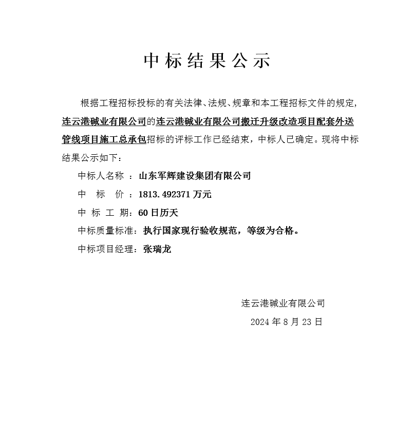 搬遷升級改造項目配套外送管線(xiàn)項目中標結果公示