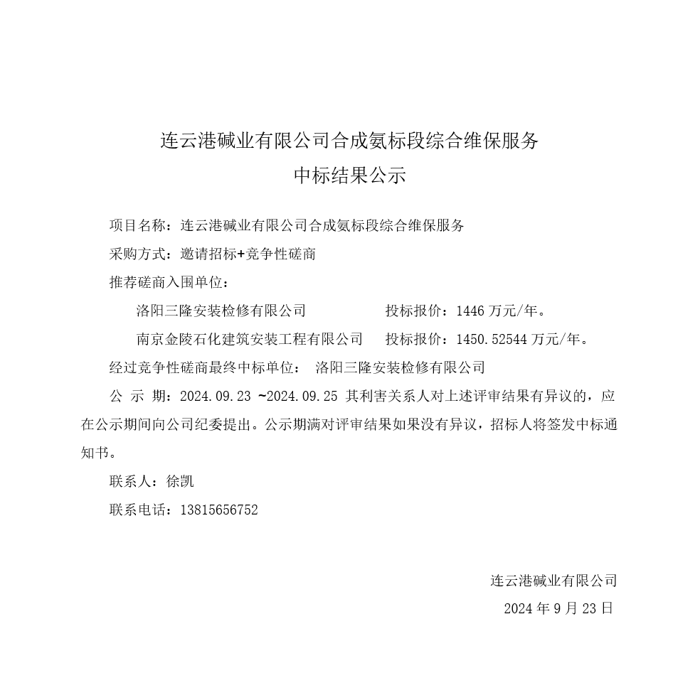 合成氨標段綜合維保服務(wù)中標結果公示