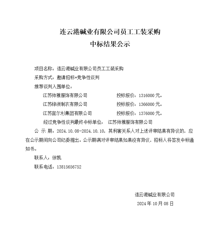 連云港堿業(yè)有限公司員工工裝采購中標結果公示