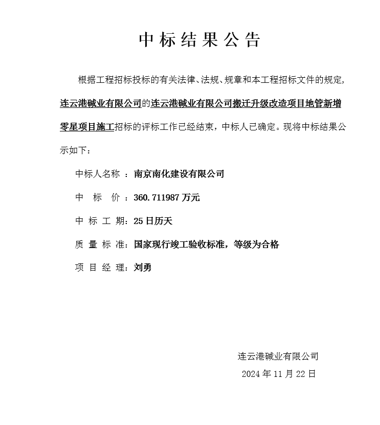 連云港堿業(yè)有限公司搬遷升級改造項目地管新增零星項目施工中標結果公告