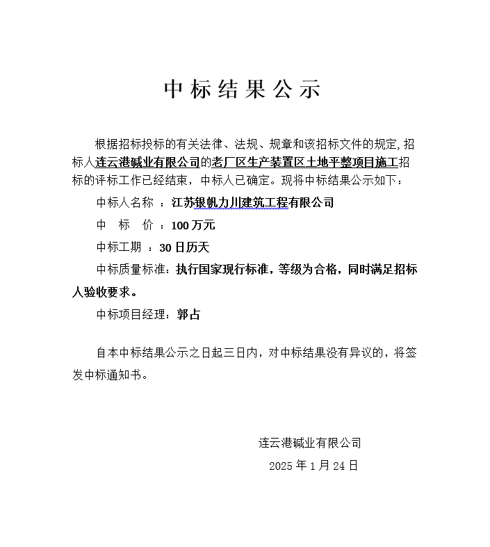 老廠(chǎng)區生產(chǎn)裝置區土地平整項目施工中標結果公示