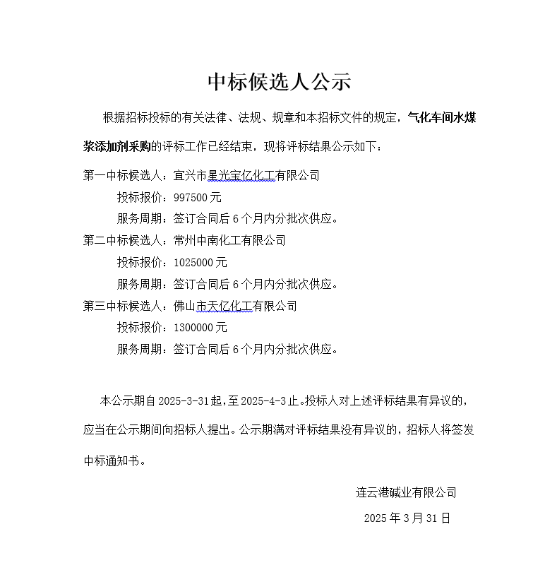 氣化車(chē)間水煤漿添加劑采購中標候選人公示